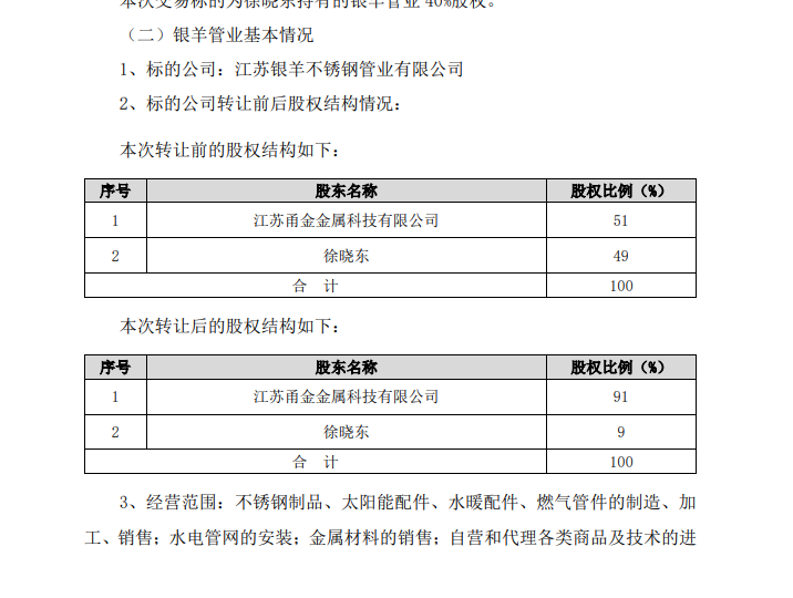 為更好管理和拓展公司不銹鋼水管業(yè)務(wù),浙江甬金金屬科技股份有限公司全資子公司江蘇甬金金屬科技有限公司與江蘇銀羊不銹鋼管業(yè)有限公司少數(shù)股東徐曉東先生于近日簽署了《股權(quán)收購協(xié)議》,公司決定以 7,975 萬元的價(jià)格收購徐曉東先生所持 銀羊管業(yè) 40%的股權(quán)。