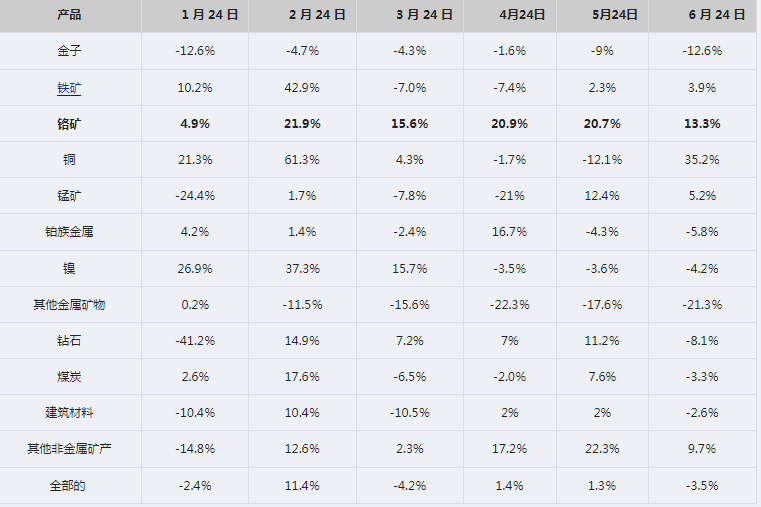 與此同時(shí),鉻礦(13.3%vs 20.7%)和錳礦產(chǎn)量增長(zhǎng)放緩(5.2%vs 12.4%)。相比之下,銅產(chǎn)量反彈(35.2%vs-12.1%)。