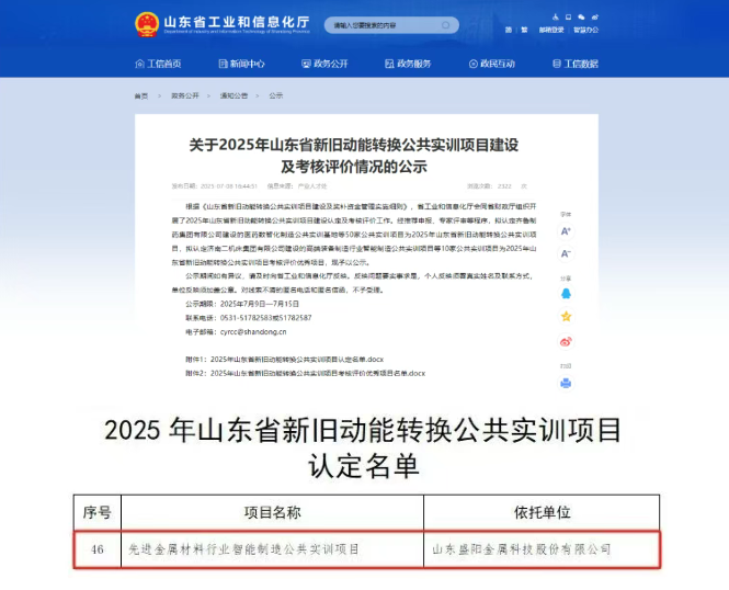 近日,山東省工業(yè)和信息化廳公示了《2025年山東省新舊動(dòng)能轉(zhuǎn)換公共實(shí)訓(xùn)項(xiàng)目認(rèn)定名單》,山東盛陽(yáng)金屬科技以“先進(jìn)金屬材料行業(yè)智能制造公共實(shí)訓(xùn)項(xiàng)目”成功入選。