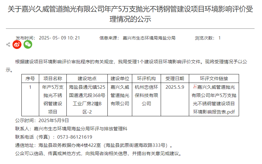 2025年5月9日, 嘉興市生態(tài)環(huán)境局海鹽分局受理嘉興久威管道拋光有限公司年產(chǎn)5萬(wàn)支拋光不銹鋼管建設(shè)項(xiàng)目環(huán)境影響評(píng)價(jià)文件并對(duì)外進(jìn)行公示。