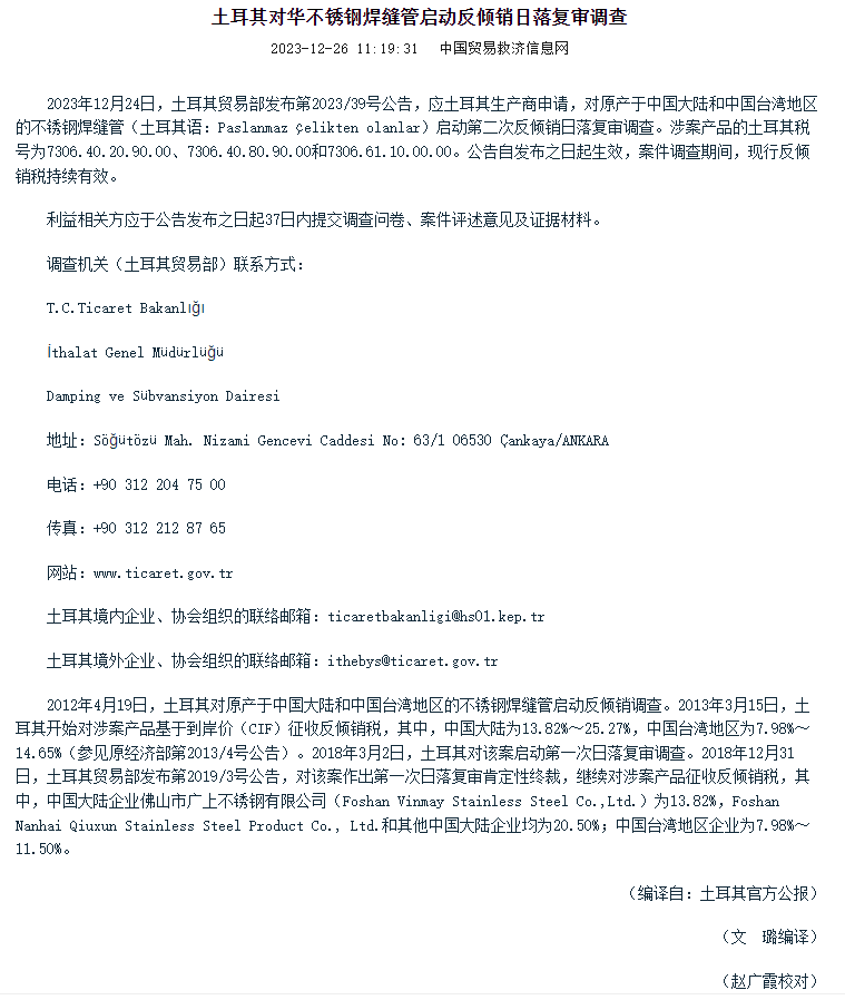 12月26日,據(jù)中國貿(mào)易救濟信息網(wǎng)一則公告《土耳其對華不銹鋼焊縫管啟動反傾銷日落復審調(diào)查》顯示,“2023年12月24日,土耳其貿(mào)易部發(fā)布第2023/39號公告,應(yīng)土耳其生產(chǎn)商申請,對原產(chǎn)于中國大陸和中國臺灣地區(qū)的不銹鋼焊縫管(土耳其語:Paslanmaz ?elikten olanlar)啟動第二次反傾銷日落復審調(diào)查。涉案產(chǎn)品的土耳其稅號為7306.40.20.90.00、7306.40.80.90.00和7306.61.10.00.00。公告自發(fā)布之日起生效,案件調(diào)查期間,現(xiàn)行反傾銷稅持續(xù)有效?!?/p>