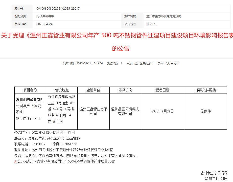 2025年4月24日,溫州市生態(tài)環(huán)境局受理《溫州正鑫管業(yè)有限公司年產(chǎn)500噸不銹鋼管件遷建項目建設項目環(huán)境影響報告表》并對外進行公告,公告時間:2025年4月24日起七個工作日。