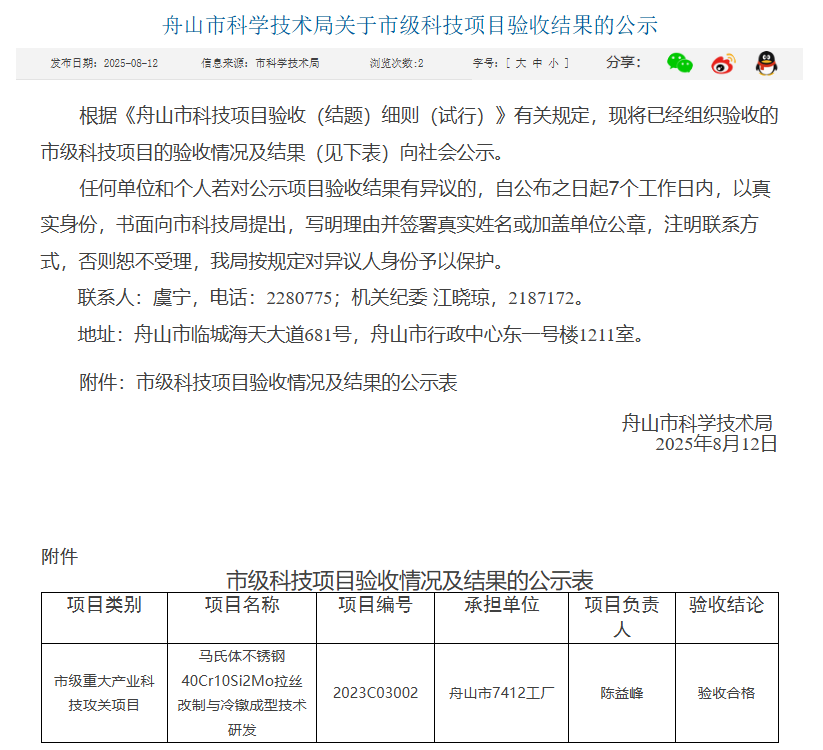 2025年8月12日,舟山市科學(xué)技術(shù)局將市級科技項(xiàng)目驗(yàn)收結(jié)果對外進(jìn)行公示,公示期:7個工作日。